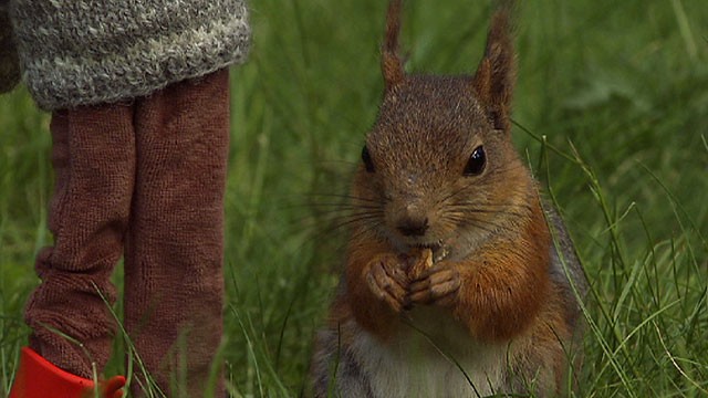 Skrutt tittar igenom sin kottsamling och hittar en kotte som någon har ätit på. Utanför finns ett stort djur med en stor svans. Vad kan det vara? Berättare: Vanna Rosenberg.