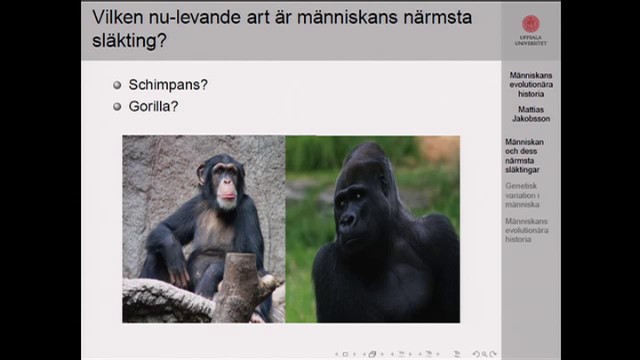 Det är enormt spännande att jobba med genetik idag. Vi är mitt uppe i den genomiska revolutionen, menar Mattias Jakobsson, forskare i evolutionsbiologi. Att komma till klarhet med den genetiska variationen i människans historia kommer att vara viktigt för många medicinska och rättsmedicinska tillämningar. För tio år sedan visste vi inte om det var schimpansen eller gorillan som var människans närmaste släkting. I dag vet vi att 70 procent av människans genom är släkt med schimpansen. Men vi vet också att människans historia är mycket mer komplex än vad vi trodde för 10-15 år sedan. Kanske var det så, att vi genetiker var lite naiva och försökte måla upp en allt för enkel bild av människans historia, förklarar Mattias Jakobsson. Vad vi gör nu är att fylla i med fler och fler detaljer. Inspelat den 3 maj 2012 på Naturhistoriska riksmuseet i Stockholm. Arrangör: Kungliga Vetenskapsakademien.