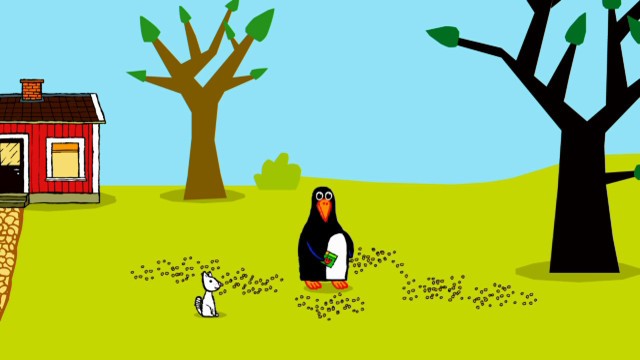I Pinos trädgård växer gurkor, sallad, äpplen, pumpor och päron. Och blommor. Pino sår frön. Pingvinen vattnar. Kaninen gräver en grop och planterar en morot. Nu är det bara att vänta på att det ska växa.