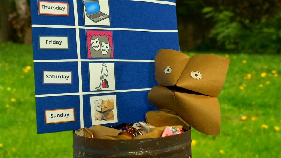 Flea vill dricka eftermiddagste med Bug, men det är svårt att hitta en lucka i Bugs veckokalender. Flea blir ledsen. Då kommer Bug på en smart lösning. "Say the days of the week!" är uppmaningen som gömmer sig bakom den randiga fliken i Fleas loppa. Barnpanelen turas om att säga namnen på veckans dagar och berättar om sina favoritdagar. Hos filurerna Penny och Gordon har det blivit kväll. Det är dags att krypa till sängs och läsa en godnattsaga. Vi lyssnar och tittar på videon till låten "The week". Engelska för de yngsta.