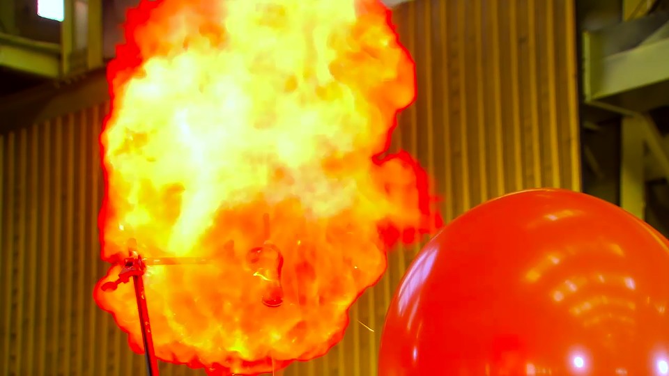 Bränder och explosioner. Experiment som visar skillnaden mellan en vätgasexplosion och en heliumexplosion, samt mellan brand och explosion.