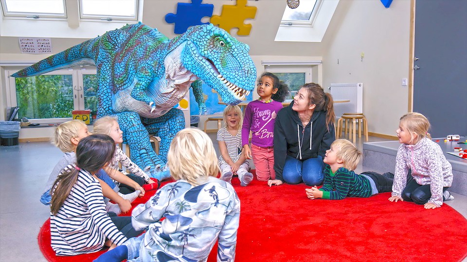 Förskolebarnen har hittat en förrymd dinosaurie i buskarna. Dinosaurien heter Tyra och är efterlyst. Tyra har nog rymt men får gärna stanna på förskolan! Hur stor är en dinosaurie? Vi mäter händer och fötter. Tyra är störst.