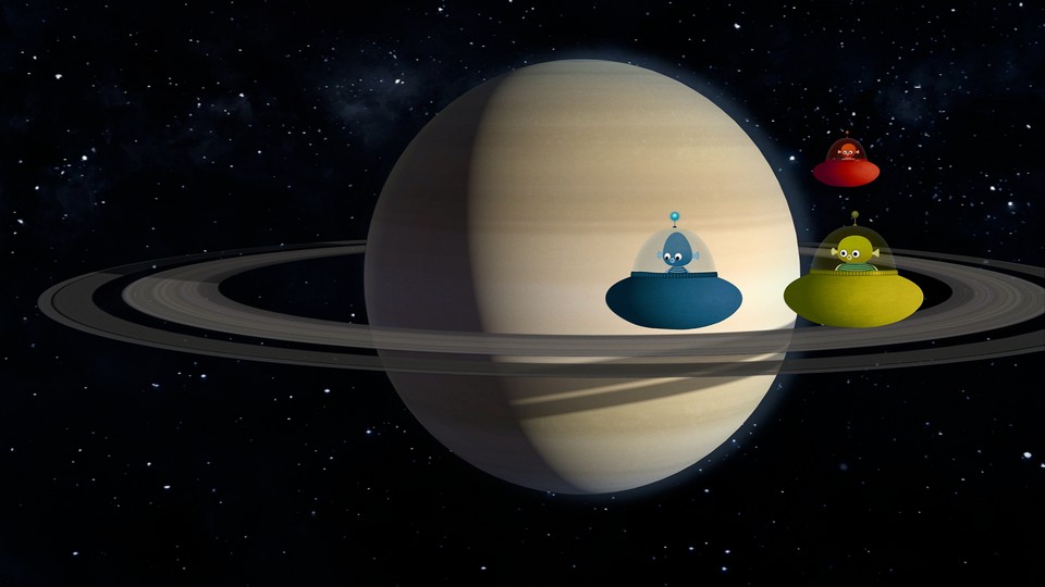 Nu är de små rymdvarelserna på väg förbi Saturnus. En stor gasplanet till. Det är en planet med många månar och en ring av grus runt sig. Vad kan en liten mångalen Ti hitta på där? Ki, Pi och Ti är på väg hem till sin egen stjärna, men fort går det inte.