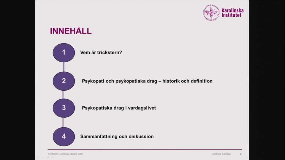 Karolina Sörman föreläser om psykopatiska drag kopplat till arbetsliv. Hon presenterar modeller som utgår ifrån att människor har varierande grader av psykopatiska drag. Kan det vara fördelaktigt att vara extremt orädd? Kan oärliga bedragare accepteras i grupper av människor där de flesta är ärliga och pålitliga? Inspelat den 5 december 2017 på Moderna Museet i Stockholm. Arrangör: Stiftelsen Ekskäret och Centrum för social hållbarhet (CSS).