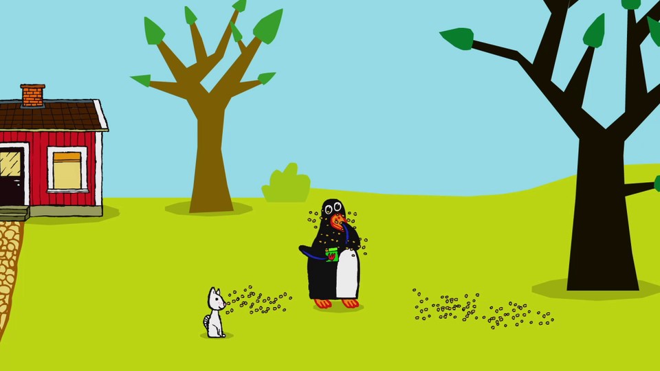 I Pinos trädgård växer gurkor, sallad, äpplen, pumpor och päron. Och blommor. Pino sår frön. Pingvinen vattnar. Kaninen gräver en grop och planterar en morot. Nu är det bara att vänta på att det ska växa.