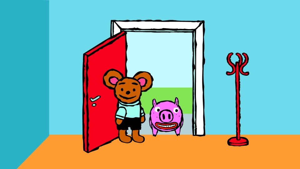 Det ringer på dörren hemma hos Pino. Utanför dörren står Grisen. Grisen går rakt in och rotar i Pinos leksakshylla. Sedan går han ut i köket. Grisen kanske vill leka kurragömma? Berättare: Abbyan Ali.