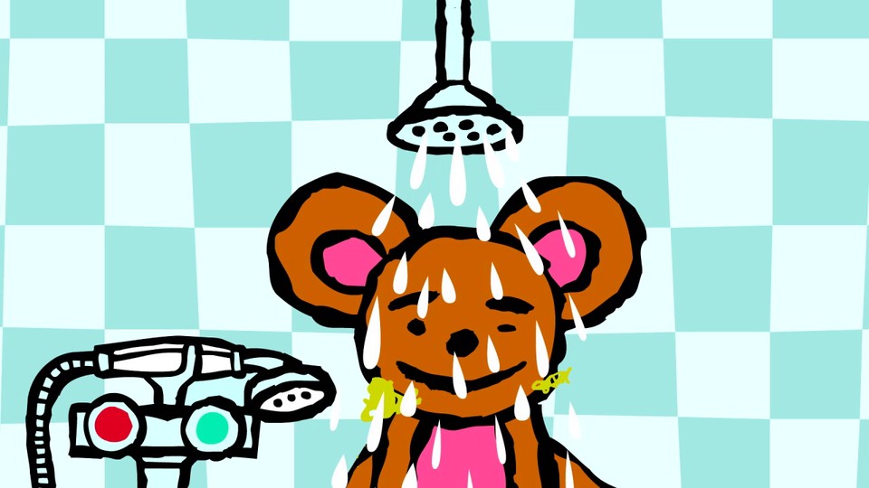 Pino har lekt i parken. Han är nu så lerig och smutsig att han behöver bada. Hemma i badrummet badar han skumbad, han älskar bubblor. Pino badar dockan men katten vill inte. Berättare: Ontira Jantaduang.