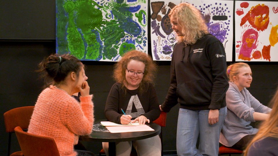 Den här gången jobbar deltagarna i grupper och skriver berättelser ihop. Övningarna ska ge inspiration till miljöer och karaktärer i texterna. I slutet av workshopen läser de tillsammans upp det de skrivit. Del 2 av 3.
