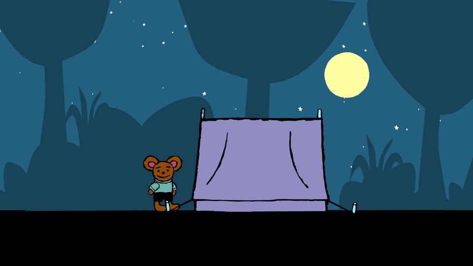 Pino och hans vänner ska ut och tälta. De badar och grillar korv, och när de ska gå och lägga sig får även några små djur skydd i tältet.