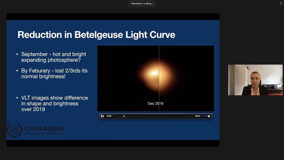 Superjätten Betelgeuse är natthimlens tionde ljusstarkaste stjärna, men under 2019 blev den oväntat mycket ljussvagare vilket väckte stort intresse bland såväl astronomer som amatörer. Holly Andrews, astronom vid Chalmers, berättar. Inspelat den 3 oktober 2020 på Göteborgs universitet. Arrangör: Vetenskapsfestivalen.