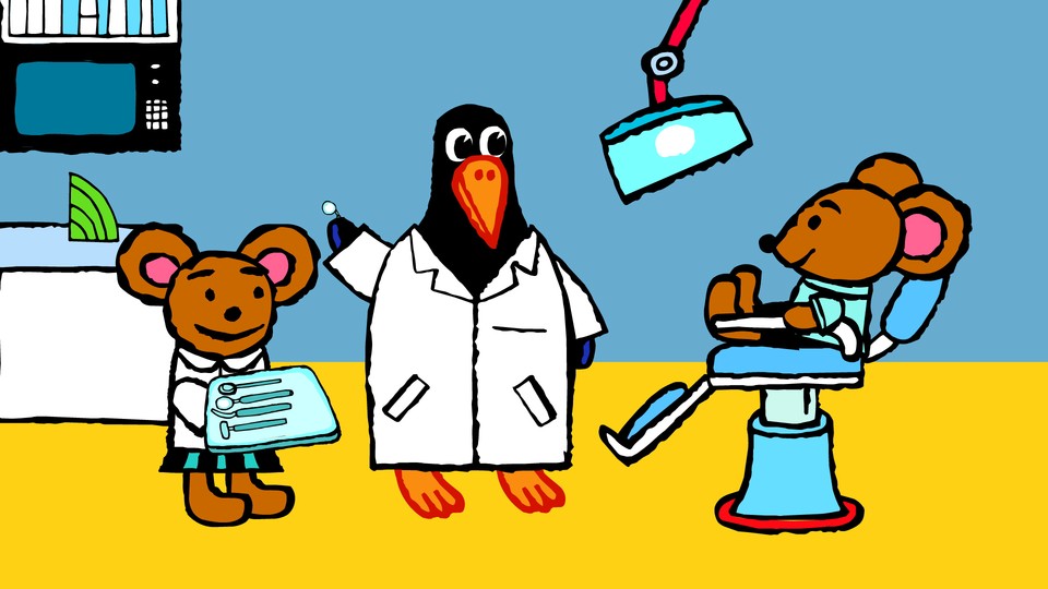 Pino är hos tandläkaren för att undersöka sina tänder. Tandläkaren är snäll och Pino får välja en leksak innan han går därifrån.