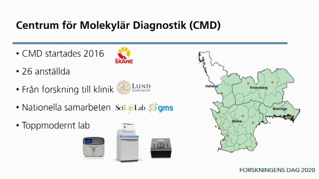 Det blir allt billigare och går allt fortare för forskare att kartlägga en människans gener. Detta har gjort det enklare att diagnostisera sjukdomar. Sofia Gruvberger Saal, doktor i experimentell onkologi, berättar om hur en kartläggning av en människas gener kan se ut och vad den kan leda till. Inspelat på Lunds universitet den 11 november 2020. Arrangörer: Lunds universitet, Malmö universitet och Region Skåne.