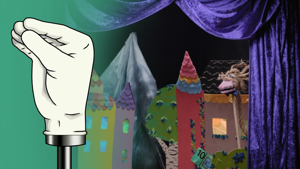 Nu blir det dockteater! Amina fixar och trixar fram två strutsar som hittar något spännande på marken.