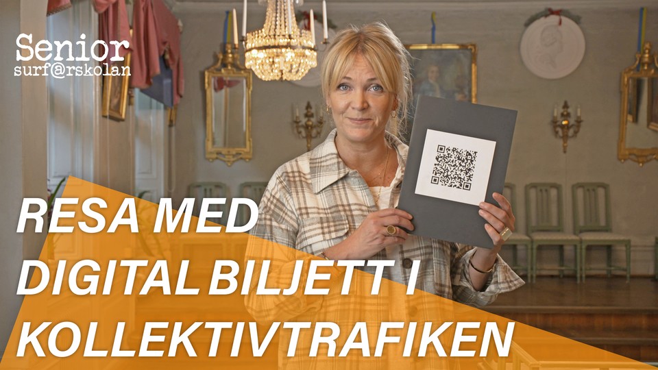 Hasse och Viveca laddar ner en rese-app och köper en e-biljett i form av en QR-kod och använder den på en bussresa. Kattis förklarar mer om QR-koder och visar hur man läser av dem med sin mobilkamera.