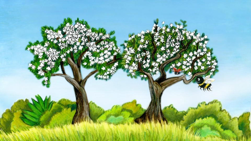 Äppelträden är fulla av bladlöss! För att inte bladen ska vissna måste Djojj få hjälp av Nyckelpigan. Bladlöss är nämligen jätterädda för nyckelpigor.