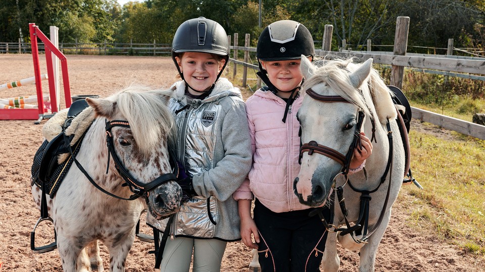Systrarna Mileia och Amelie har varsin ponny i Billnäs. Ute på ridplanen övar de hoppning och inne i manegen visar de hur man kan rida utan hästar! I dag ska dessutom ponnyerna gå på restaurang.
