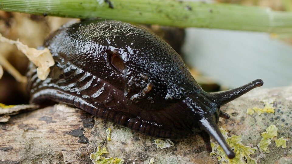 Det här är den svarta skogssnigeln. Den ser och smakar med sina fyra känselspröt. Skogssnigeln är en växtätare med en viktig roll i ekosystemet och markens näringscykel.