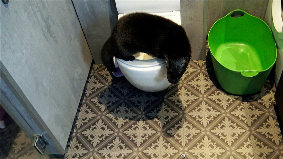När Sven har ätit sig mätt blir han törstig. Alla de glas och flaskor som han hittar är tomma, men i toalettstolen finns det förstås vatten även om hans vänner inte uppskattar hans lukt efteråt.