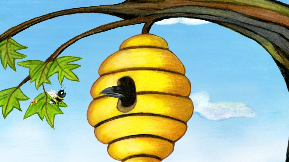 En kråka har flyttat in i bikupan och skrämt bort alla bin som flytt till ett bihotell. Djojj och Birger funderar över hur de ska få ut kråkan ur kupan.
