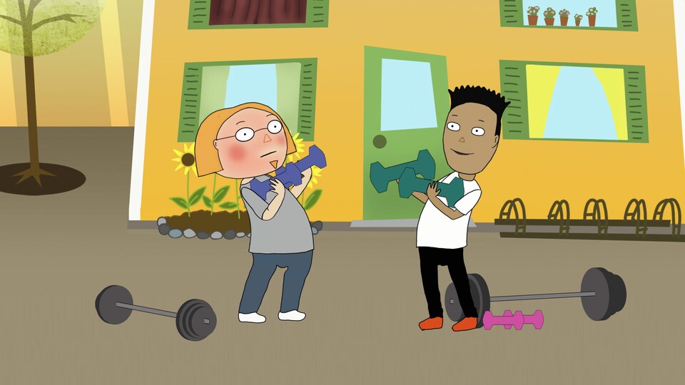 Pappa Erik och tonårssonen James ses på gården och styrketränar. James hetsar Erik, de lyfter tyngre och tyngre hantlar och springer runt huset tills Erik får andnöd. Efter en stund kommer mamma Florence ut med bebisen på armen. Erik och James vill visa upp sina muskler för henne. Men Florence är inte så intresserad.