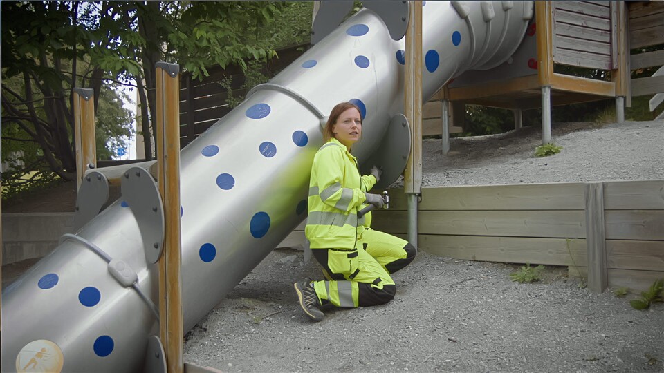 Vi är i parken. Parkarbetarna Hugo och Martina är också här, det är deras arbetsplats. De ser till att allting fungerar i parken och att det ser fint ut. Idag klipper de gräset, planterar nya blommor och sätter upp en gunga. Gissa om barnen som kommer hit gillar det.