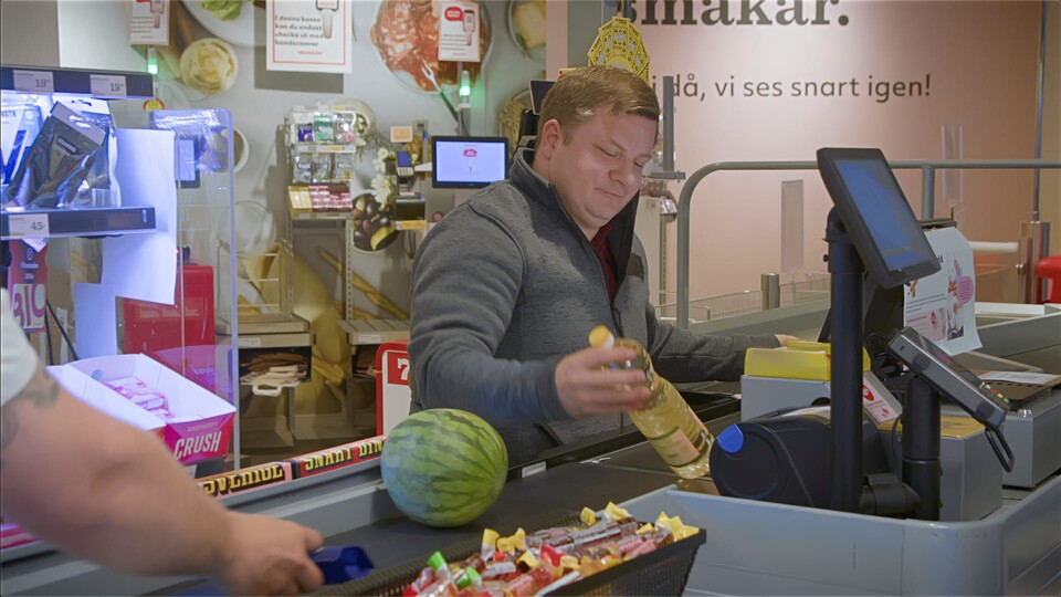 På det här jobbet säljer man saker. De som jobbar här plockar fram varor och hjälper kunderna som kommer och handlar. Sen sitter de i kassan och tar betalt. Vad kallas deras yrke? Lyssna på ljuden och gissa!