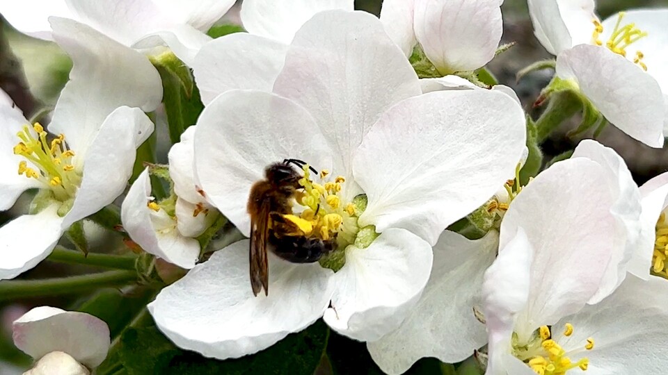 Tripp och Trapp hamnar vid en bikupa och äppelträd i trädgården. Det är vinter och bina är inne i bikupan där de vilar tätt ihop och värmer varandra. När våren kommer är det dags att flyga ut och samla nektar. De flitiga arbetsbina samlar hela sommaren och i bikupan blir det till honung. De flyger från blomma till blomma, äppelträdets blommor blir kart och till sommaren äpplen. Dags att skörda bär och frukter i trädgården. Till hösten förbereder bina vintern och flyttar in till bidrottningen igen.