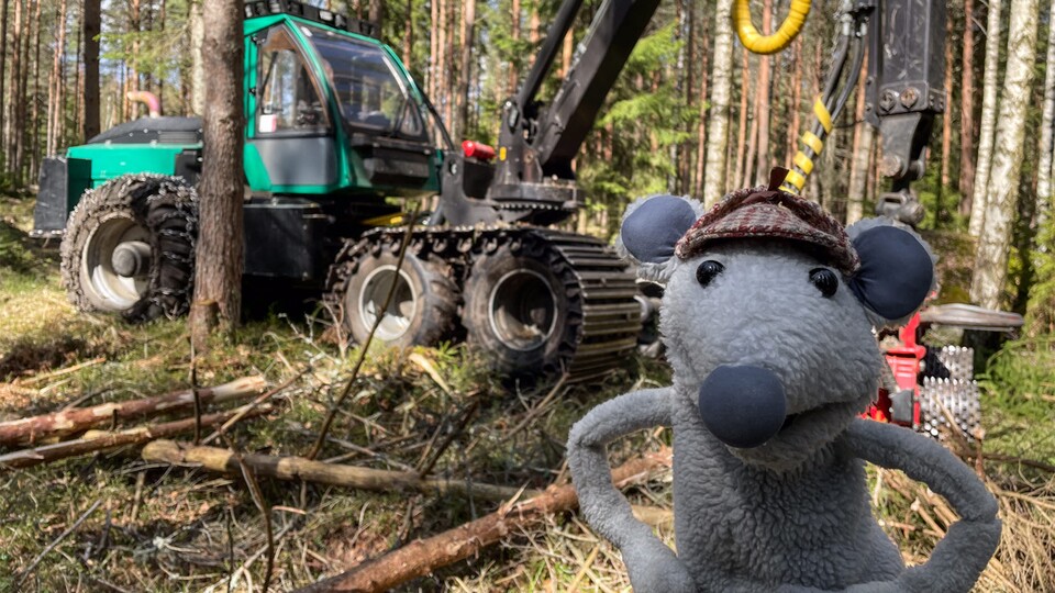 Häng med Måsse ut i skogen när han undersöker nästa fordon - en skogsmaskin! Måsse får även prova att styra den helt själv.