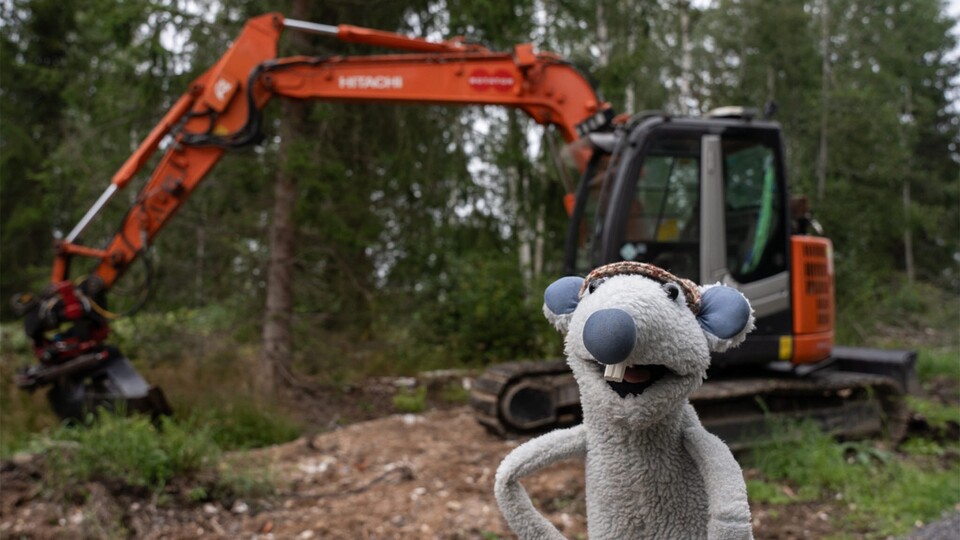 Måsse undersöker en grävmaskin. Det finns en massa spakar och pedaler – men vad gör de egentligen? Det ska Måsse berätta för dig!