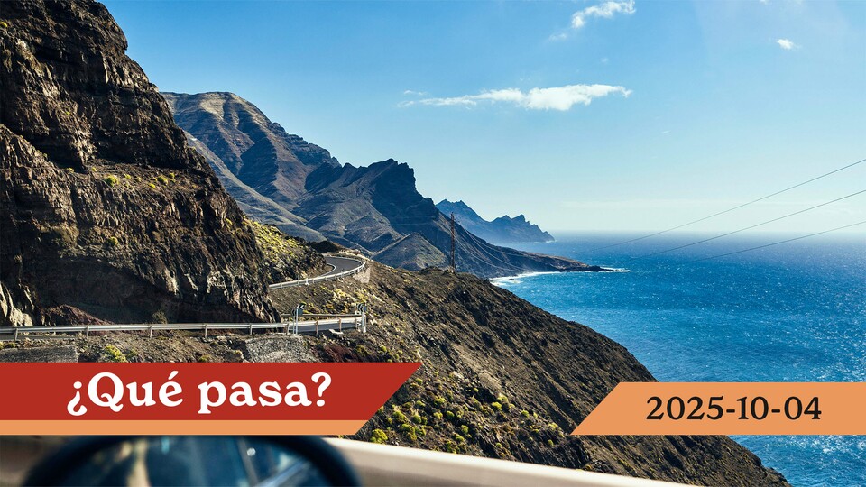 Nyheter från den spanskspråkiga världen på medelsvår spanska. Vägblockeringar och protester mot kriget i Gaza under kända cykeltävlingen La vuelta ciclista i Spanien. Vissa svenskar känner Kanarieöarna som ett turistmecka med stora hotellkomplex och bekväma pooler. De som bor där har en annan bild. Sara berättar att hon uppskattar mikroklimaten och Carlos gillar värmen hos människorna.