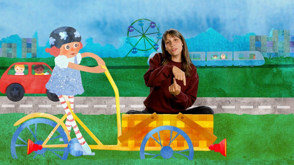 Om bussar, bilar och annat med hjul som snurrar. Petra Hellsing sjunger och förstärker ord och begrepp med tecken. Text och musik av Klas Widén och illustrationer av Anya Winqvist.