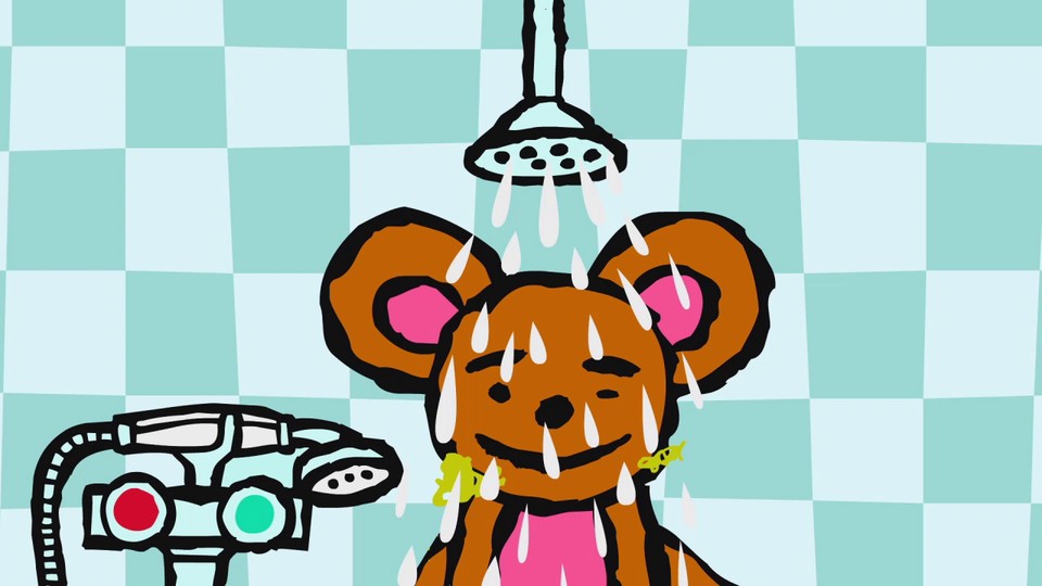 Pino har lekt i parken. Nu är han lerig och smutsig och behöver bada. Hemma i badrummet badar han skumbad. Han älskar bubblor. Pino badar dockan och tvättar hennes hår. Katten behöver också bada. Men katten vill inte. Fiskarna får bada med Pino.