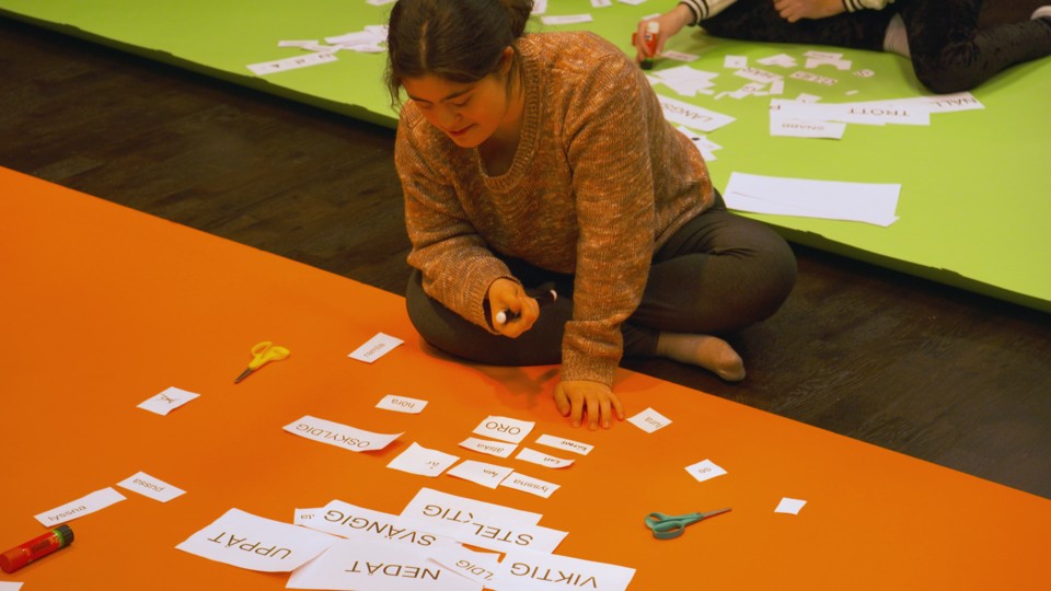 Deltagarna gör korta texter och dikter med hjälp av slumpmässigt valda ord. Genom klipp- och klistraövningar får de hjälp att samla på sig ord som de sedan kan använda när de skapar sina texter. I slutet av workshopen läser de upp det de skrivit. Del 1 av 3.