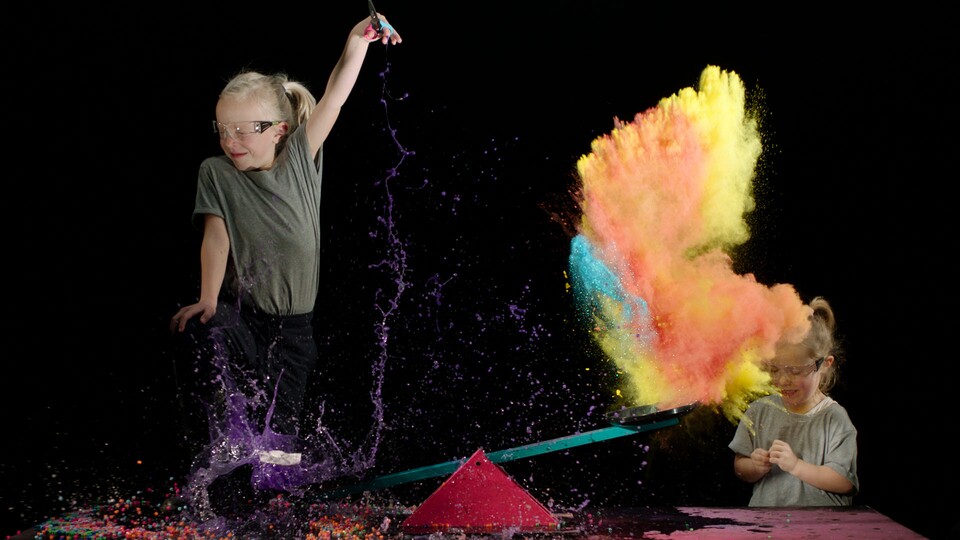 Två barn skapar en färgexplosion med vattenballonger, färg och pärlor. Ett sprakande experiment som fyller luften med färg och kreativitet.