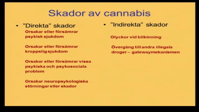 Jan Ramström, överläkare och författare, ger en aktuell forskningsöversikt över de direkta och indirekta skador som cannabisrökning kan leda till. Propaganda om hasch och marijuana sprids över internet och intressegrupper trycker på för legalisering av droger. I det här bruset är det svårt att nå fram med alternativ forskningsinformationen om drogens skadeverkningar, menar Ramström. Inspelat i februari 2013. Arrangör: Nationella cannabisnätverket.