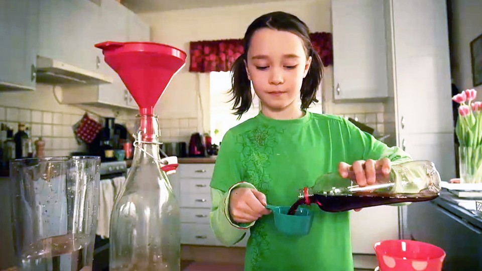 Matilda blandar saft hon ska ha med på utflykten till skolan. Hon häller i två deciliter saft. Men hur mycket vatten häller hon i?