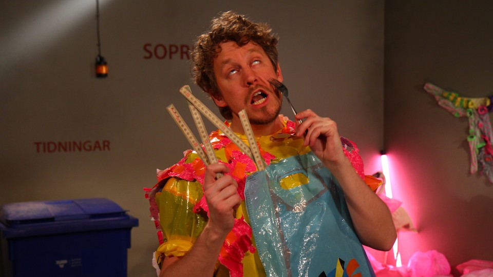 Möt Ture i en språkutvecklande sketch på teckenspråk. Ture skapar en ryggkliare av det som dimper ned i sopnedkastet.