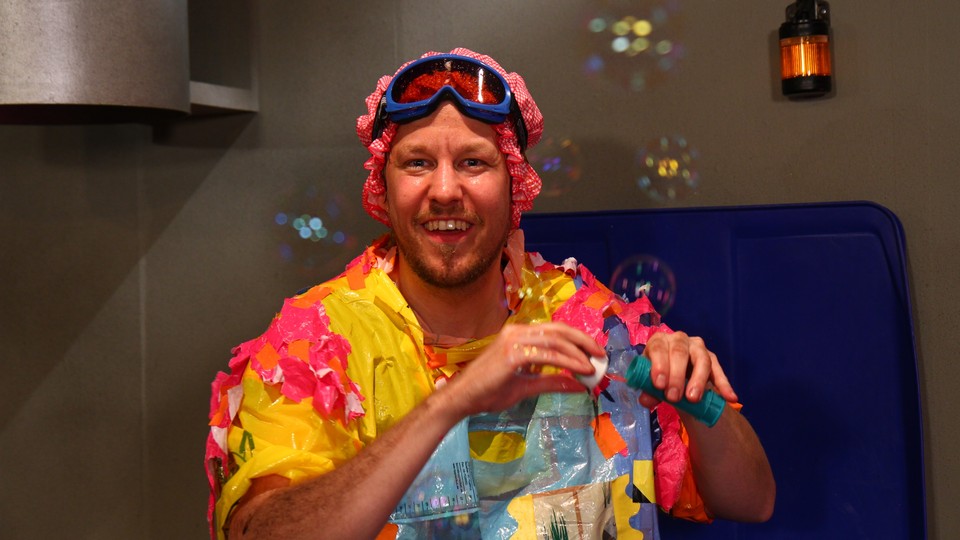 Möt Ture i en språkutvecklande sketch på teckenspråk. Ture skapar en dusch av det som dimper ned i sopnedkastet.