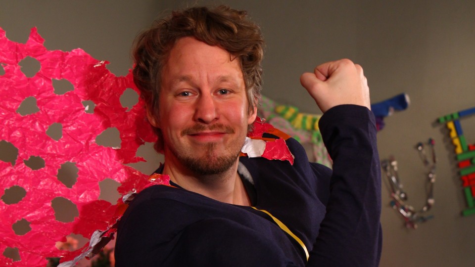 Möt Ture i en språkutvecklande sketch på teckenspråk. Ture skapar en muskeltröja av det som dimper ned i sopnedkastet.