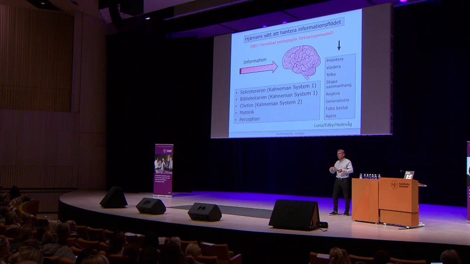 Kenth Hedevåg, med lång bakgrund som specialpedagog i ett neuropsykiatriskt utredningsteam och som pedagogisk handledare i ett kommunalt stödteam, delar här med sig av sin kunskap. Forskningen om hjärnans sätt att ta emot och processa information gör stora framsteg och skolan behöver översätta forskningsresultaten till pedagogik. Fler och fler barn och ungdomar uppvisar svårigheter i skolsituationen. En del har diagnoser som adhd eller inom autismspektrat, andra har ingen diagnos men ändå stora svårigheter i skolan. Hur kan vi hjälpa dessa elever på bästa sätt? Moderator: Sven Bölte. Inspelat den 31 oktober 2017 på Karolinska institutet, Stockholm. Arrangör: KIND, Karolinska institutet. Del 2 av 2.