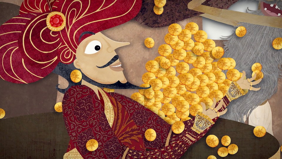 Om en kung från Punjab, som i utbyte mot guld, låter sig kokas och ätas till frukost varje morgon. Den som låter sig väl smaka är en blind enstöring med en magisk hatt. Animerad saga från Indien om vad det innebär att vara generös.
