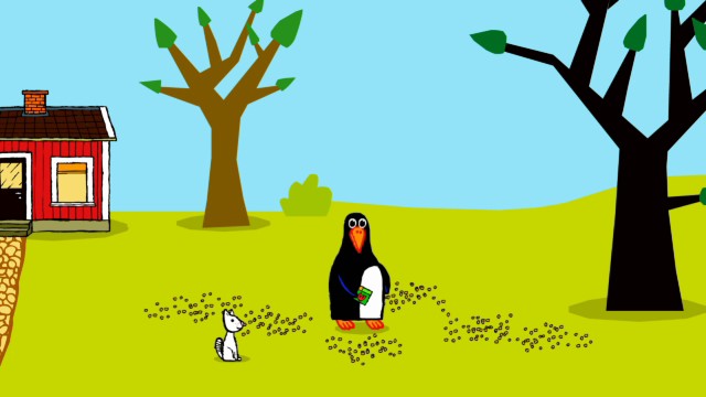I Pinos trädgård växer gurkor, sallad, äpplen, pumpor och päron. Och blommor. Pino sår frön. Pingvinen vattnar. Kaninen gräver en grop och planterar en morot. Nu är det bara att vänta på att det ska växa.