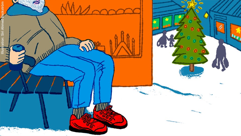 Det är snart jul. Dino tittar i affärer. Allt glittrar och plingar. Utanför köpcentret sitter en gubbe. Han dricker öl och skriker. När Dino går hemåt hör han ett ljud ifrån skogen. Gubben! Han ligger där och ropar på hjälp. Men han är full och alldeles blodig. Vad gör Dino nu? En serie som riktar sig till elever som läser svenska som andraspråk på låg- och mellanstadiet.