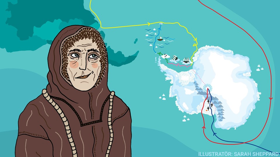 Längst ner på jordklotet ligger Antarktis och Sydpolen. Här är det svinkallt, köldrekordet ligger på hela minus 89 grader. Scott-expeditionen trodde de skulle bli först till Sydpolen. När de kom fram möttes de emellertid av en norsk flagga och ett brev från polarfararen Roald Amundsen och hans expedition. Utmattade vände de om för att påbörja sin långa resa hem. Hur det gick? Inte så bra.