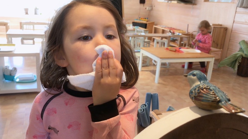 När man äter kan maten snabbt hamna här och där i ansiktet, men på förskolan blöter barnen tygservetter som de kan tvätta sina ansikten med efter måltiden.