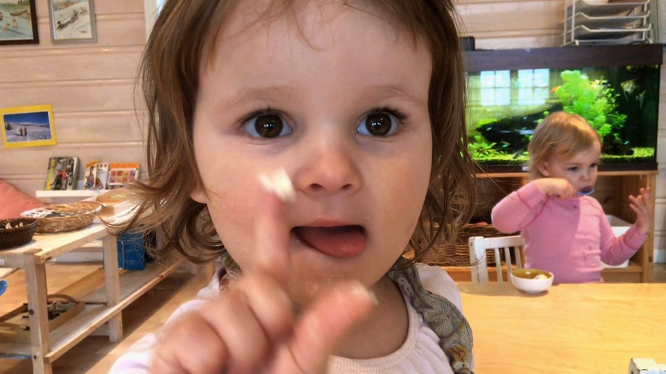 Det är tid för mellanmål på förskolan och barnen gör i ordning maten och dukar bordet.
