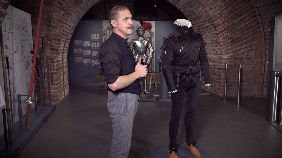 Rustningsmakarmästaren Albert Collins visar upp ett nytillverkat underplagg till rustningen som återskapats med hjälp av det underplagg som Erik Sture bar då han avrättades av Erik XIV år 1567. Inspelat på Livrustkammaren i Stockholm den 6 november 2020. Arrangör: Livrustkammaren.