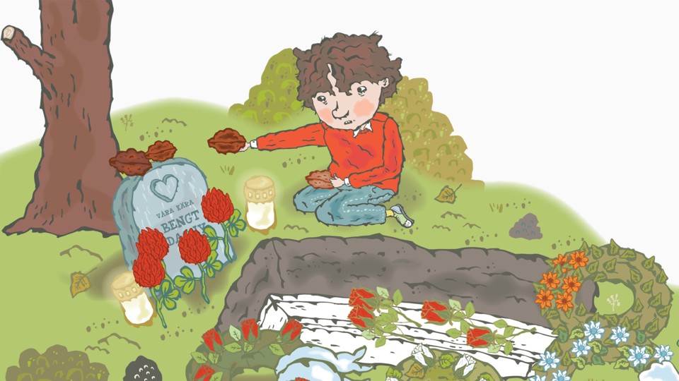 Del 11. Morfar ska begravas. Många finklädda människor har kommit till kyrkan. Prästen talar fint om morfar och många gråter. Sedan bärs kistan ut till kyrkogården. Elliot väntar tills gästerna gått därifrån, då lägger han några nötter på gravstenen - ifall morfar blir hungrig.