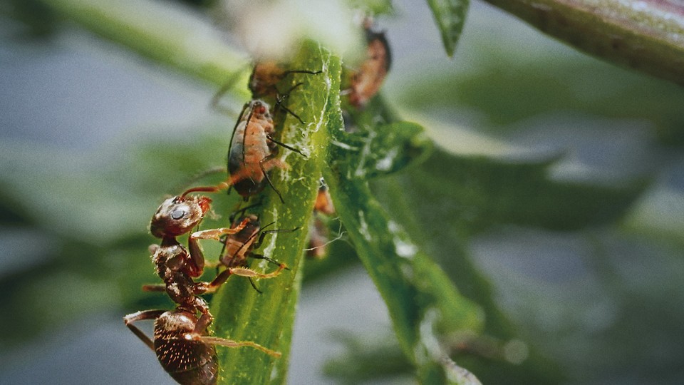 Den svarta trädgårdsmyran är nästan en sorts lantbrukare. För på samma sätt som en lantbrukare sköter om grisar och kor har trädgårdsmyran bladlöss som den sköter om. Myran äter bladlössens bajs som smakar sött och kallas honungsdagg. Men det finns även många nyckelpigor i trädgården som vill äta upp bladlössen. Myran måste jaga bort nyckelpigorna om den ska få ro att ta hand om sina bladlöss.
