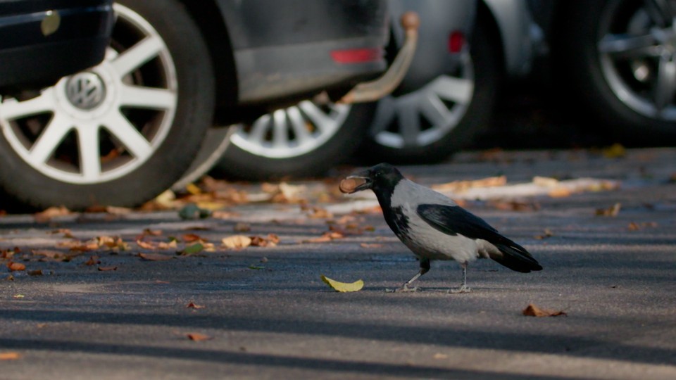 Inne i stan ligger det nötter på vägen som knäckts när bilarna kört över dem. Det är ett väldigt smart djur som har slängt nötterna på vägen så att nötskalen knäckts av bilarna. Men kan du gissa vilket djur som är så smart?